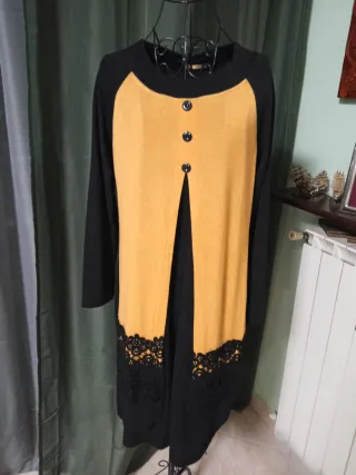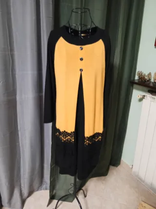 Vestito invernale da donna con un design a blocchi di colore. - Maniche lunghe nere. - Pannello frontale giallo. - Dettaglio in pizzo nero sul fondo.
