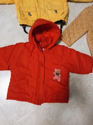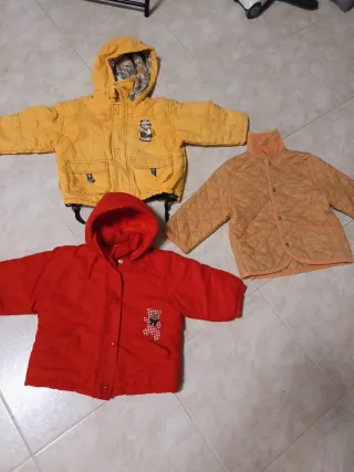 Lotto composto da tre giubbini per bambino, adatti per un'età tra i 18 e i 24mesi. - Giubbino giallo con stampa orsetto e fodera a quadri. - Giubbino arancione trapuntato. - Giubbino rosso con applicazione a scacchi.