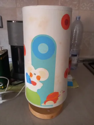 Lampada da comodino con un simpatico design per bambini. - Base in legno. - Decorazioni colorate con personaggi. - Cilindro decorativo.