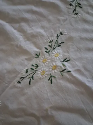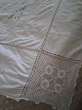 Bellissima tovaglia antica, finemente ricamata a mano con dettagli floreali e rifinita con un elegante bordo in pizzo realizzato a uncinetto 123 per 164 cm Ottime condizioni - Ricami floreali fatti a mano. - Bordi in pizzo all'uncinetto. - Tessuto bianco.