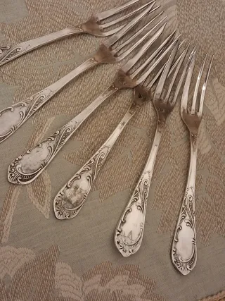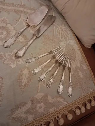 Elegante set di posate per torte, realizzato in lamina d'argento 1000. Il set include una paletta e un coltello per torte, oltre a sei forchette. - Design raffinato con decorazioni. - Materiale: lamina d'argento 1000.