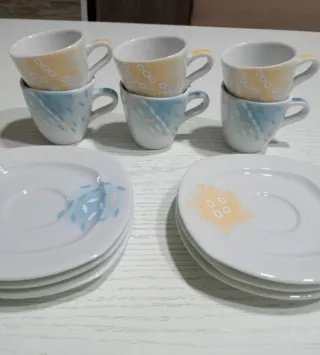 Elegante set di quattro tazzine da caffè in porcellana, perfette per gustare il tuo espresso. - Design moderno con decorazioni a tema floreale e astratto. - Manici comodi per una presa sicura. - Piattini coordinati inclusi.