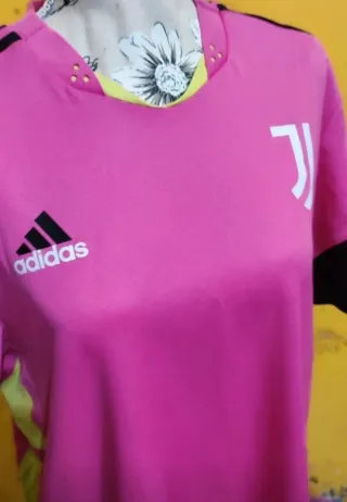 Maglietta da allenamento Adidas Juventus, taglia L. Colore fucsia con dettagli neri e inserti colorati sul fianco. - Logo Adidas sul petto. - Logo Juventus sul petto.
