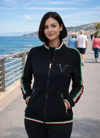 Giacca sportiva Versace 19V69 da donna. - Design con bande tricolore su maniche e colletto. - Logo V 19V69 decorato con strass sul petto. - Chiusura frontale con zip dorata. - Tasche laterali con zip.