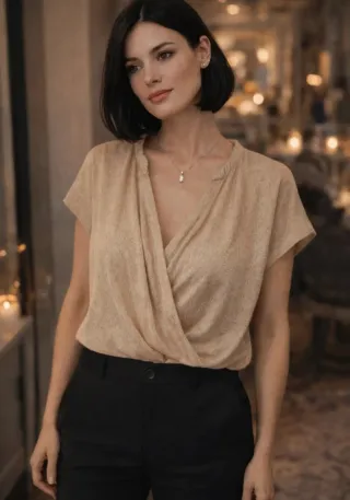 Elegante camicetta color oro, perfetta per un look sofisticato. - Tessuto leggermente scintillante. - Design a incrocio. - Maniche corte. Nuova senza cartellino