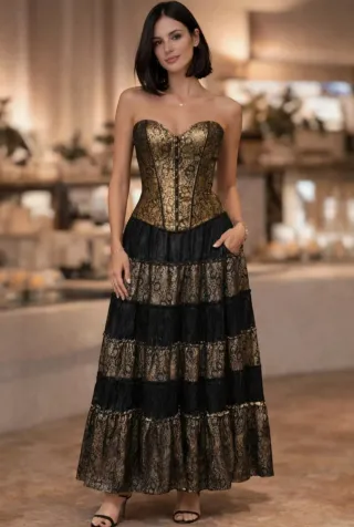 Elegante gonna lunga vintage, perfetta per occasioni speciali. Un capo unico che aggiunge un tocco di classe al tuo guardaroba. - Design a balze con dettagli in pizzo. - Vita alta che valorizza la figura. - Tessuto broccato con motivi floreali dorati. Il corpetto non è il vendita Prezzo nuovo 399€