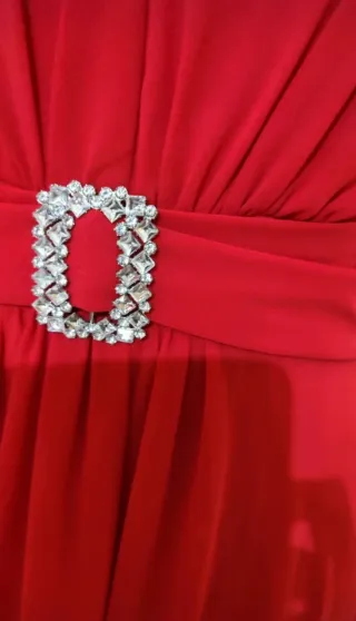 Elegante abito lungo da cerimonia. Perfetto per occasioni speciali. - Scollo a V. - Cintura con fibbia decorativa. - Tessuto fluido.