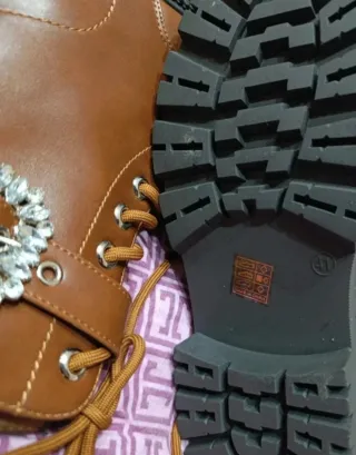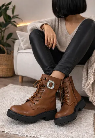 Stivaletti anfibi da donna in un caldo color marrone, perfetti per completare ogni outfit. - Design stringato con zip laterale per una calzata personalizzata. - Dettaglio fibbia decorata con strass sulla caviglia. - Suola chunky in gomma per un look deciso e moderno.