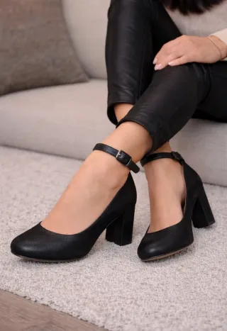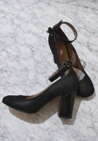 Eleganti décolleté nere con cinturino alla caviglia e tacco largo. - Materiale effetto glitter. - Chiusura con fibbia. - Tacco largo e squadrato con finitura lucida.
