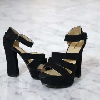 Eleganti sandali neri con tacco alto e plateau. - Design con cinturino alla caviglia. - Dettagli con fasce incrociate. - Tacco largo e stabile.