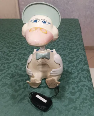 Lampada da notte a forma di oca con lettore cassette, un classico vintage Chicco, completo di adattatore 12 volts L'oggetto non è in buone condizioni, ha una zampa incollata (come da foto) e il lettore cassette non funziona, leggera presenza di segni di usura. Altezza circa 40 cm Ideale per collezionisti Formula visto è piaciuto -