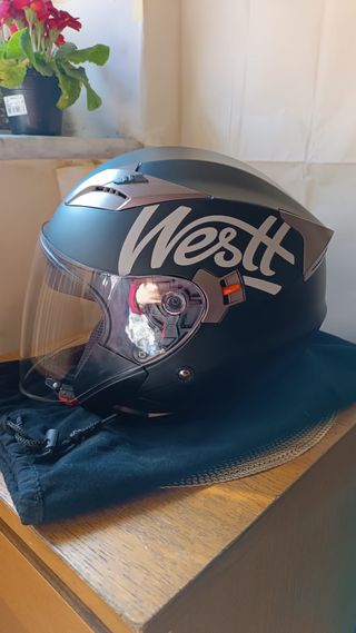 Casco da moto Westt, taglia XL, colore nero. - Omologazione ECE R22-05. - Design moderno con finiture argentate. Casco integrale Westt, certificato ECE R22-05. La taglia è XL, adatta per circonferenze craniche da 61 cm. Il peso è di circa 1340+-50 grammi. In una delle foto si può osservare la custodia di stoffa per proteggere il casco. Il Pacco è trasportabile anche in altri luoghi non solo limitato alla mia cittadina. - Colore nero opaco con dettagli argento. - Visiera trasparente. - Sistema di ventilazione integrato. - Visiera trasparente.