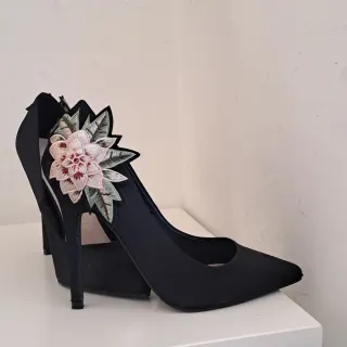 Eleganti decolleté Limited Edition nere con una graziosa applicazione floreale. - Dettaglio di fiori rosa e foglie verdi. - Punta affilata. - Tacco sottile.