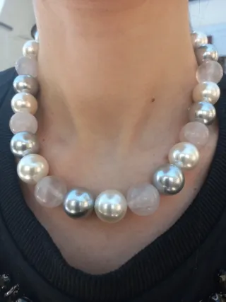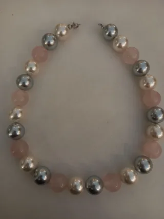 Elegante collana con perle e pietre di quarzo rosa. - Perle grandi e luminose. - Pietre di quarzo rosa sfaccettate. - Design unico e raffinato. Cm 45 con chiusura in argento925