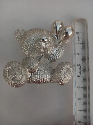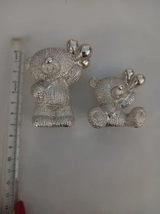 Grazioso set di due orsetti argentati, perfetti come decorazione. - Orsetto grande con palloncini. - Orsetto piccolo con palloncini. - Finitura metallica lucida. Firmati argenesi made in italy
