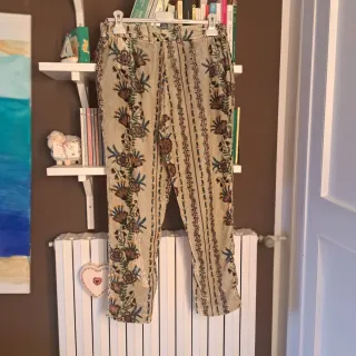 Eleganti pantaloni in velluto liscio con una bellissima fantasia floreale. - Tessuto morbido e confortevole. - Motivo floreale multicolore su fondo beige. - Vita media con passanti per cintura.. tasche laterali