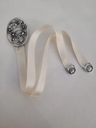 Elegante segnalibro con finiture in argento 800 e nastro di raso color crema.