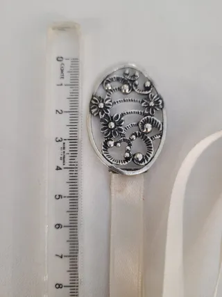 Elegante segnalibro realizzato in argento 800. - Design ovale con decorazioni floreali. - Nastrini in raso bianco con terminali in argento.