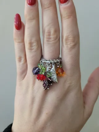 Anello in argento 925 regolabile con ciondoli raffiguranti la frutta realizzati a mano con cristalli Swarovski. pezzo unico