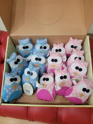 Set di 14 appendini a forma di gufo, perfetti per decorare durante il periodo pasquale. - Gufi in tessuto con pois. - Colori disponibili: azzurro e rosa. - Dettagli in feltro.