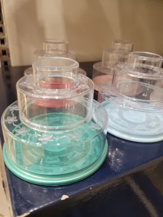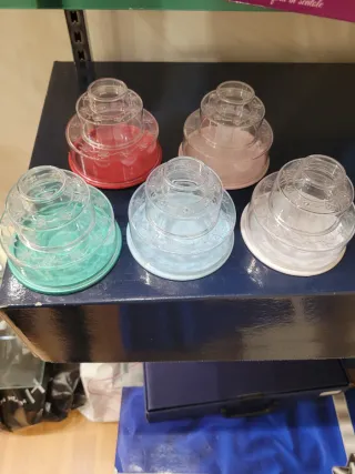 Set di 5 contenitori portaconfetti in plastica trasparente con decorazioni floreali. Ideali per bomboniere o piccoli oggetti. - Colori assortiti: rosso, rosa, verde acqua, azzurro e bianco. - Design a più livelli sovrapponibili.
