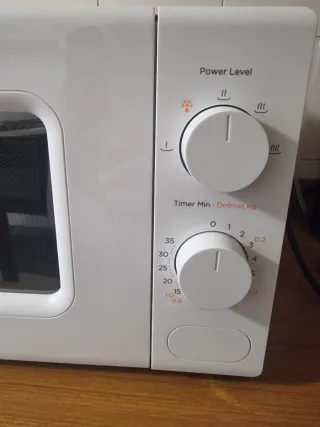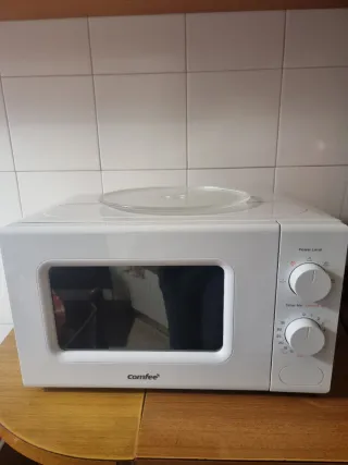 Microonde Comfee di colore bianco. - Pannello di controllo con manopole per potenza e timer. - Piatto girevole in vetro.