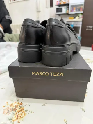 Eleganti mocassini Marco Tozzi, mai indossati. - Design moderno con catena decorativa. - Tomaia in similpelle nera. - Suola platform.