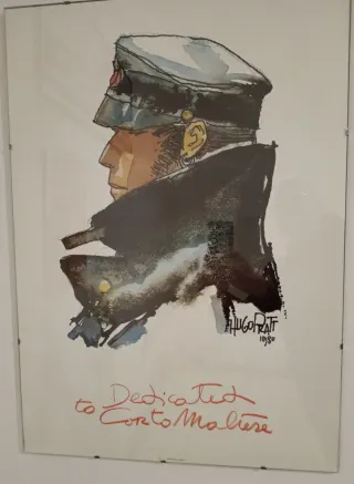 Stampa originale di Hugo Pratt, raffigurante Corto Maltese. - Firma dell'artista Hugo Pratt. - Anno 1980. - Dedica Dedicated to Corto Maltese. Con cornice a giorno è venduta a 38.00 euro, senza a 33 euro