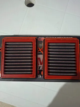 Coppia di filtri aria BMC per Honda Africa Twin 1000. - Filtri lavabili e riutilizzabili. - Telaio rosso. - Materiale filtrante grigio.