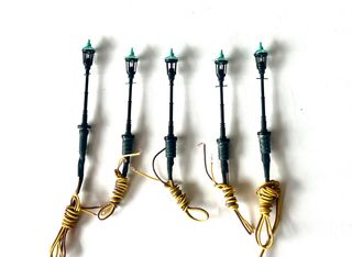 Set di 5 lampioni stradali in miniatura, perfetti per modellismo. - Lampioni con dettagli curati. - Cavi di collegamento inclusi. - testati e funzionanti - uno ha basetta modificata