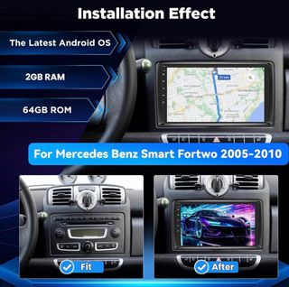 Autoradio Android con schermo da 9 pollici, Compatibile con Mercedes Benz Smart Fortwo 2005-2010 – QuestoSistema Android aggiornato con WiFi – Dotato di 2GB RAM + 64GB ROM offre prestazioni fluide. Connettiti all’hotspot WiFi per guardare Netflix, YouTube o utilizzare altre app online. Compatibile con DVR, DAB si adatta perfettamente al cruscotto con integrazione in stile originale. Supporta i comandi al volante - Memoria interna 2+64G. - Sistema operativo Android. - Schermo touch screen. - Include telecamera posteriore.