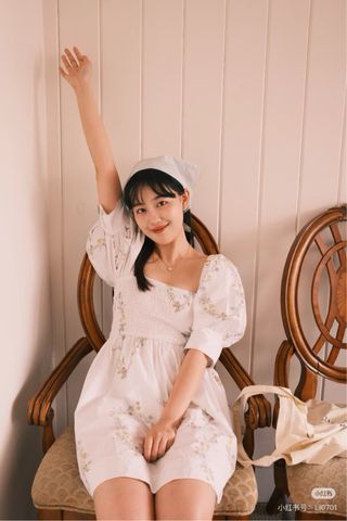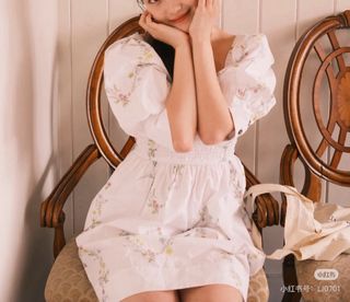 Elegante vestito GANNI con una stampa floreale su sfondo bianco. Perfetto per ogni occasione. - Scollo quadrato. - Maniche a sbuffo. - Tessuto leggero e confortevole.