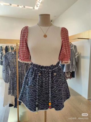 Top Maje ecru con maniche in tweed rosa. Nuovo. - Maniche a sbuffo. - Scollo rotondo. - Tessuto a coste sul busto.