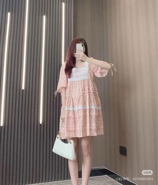 Vestito corto MAJE con dettagli in pizzo. - Scollo quadrato con inserti in pizzo. - Maniche corte a sbuffo. - Gonna a balze. - Fantasia floreale.
