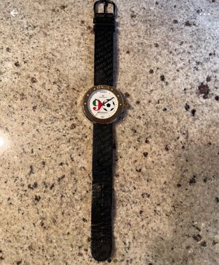 Prezzo di mercato: 130€ Vendo Orologio raro mondiali Italia 90' con autografo Walter Zenga in condizioni quasi perfette. Marca: Pryngeps Modello: Mondiali Italia 90' Dedicato a: Walter Zenga (il suo autografo è inciso sul fondello) Condizioni: quasi perfette, con scatola originale e ricevuta d'acquisto del 28-09-1989 Movimento: Quartz Cinturino: Nero, in vera pelle clm una stampa ripetuta con la scritta "ITALIA".
