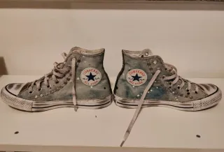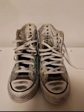 Scarpe Converse All Star modello vintage, mai indossate. - Design unico con borchie e schizzi di vernice. - Tomaia in denim effetto used. - Altezza alla caviglia.