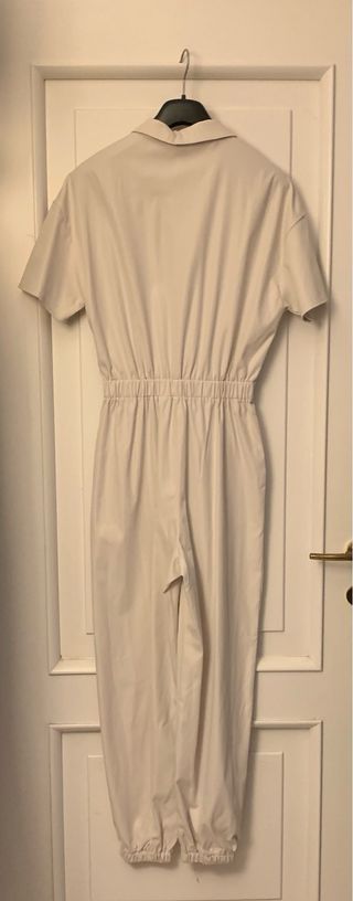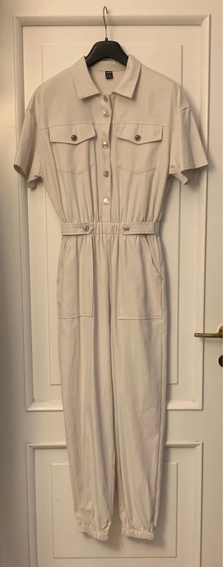 Tute stile safari in color beige. Presenta un design con colletto e chiusura a bottoni.