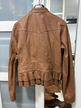 Vendo giacca in vera pelle color marrone/cuoio, modello corto con zip frontale e tasche con zip. Linea elegante e femminile, pelle morbida e di qualità, ideale per mezza stagione o serate primaverili/autunnali. La giacca è in ottime condizioni, senza strappi né difetti evidenti. Vestibilità comoda ma sagomata, molto versatile sia con jeans che con abiti.
