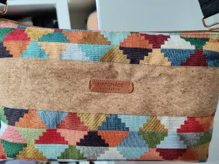 Borsa a tracolla con un design vivace e dettagli in sughero. - Fantasia geometrica multicolore. - Pannello centrale in sughero. - Tracolla regolabile nera.