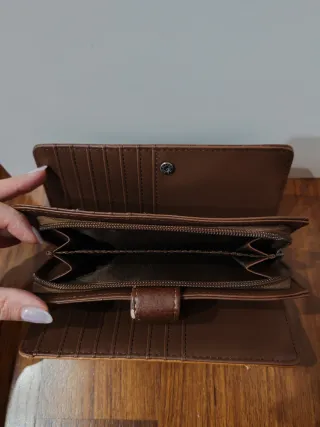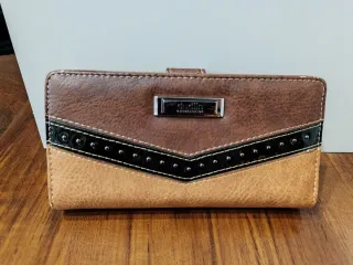 Elegante portafoglio da donna in tonalità marrone, con un design moderno e dettagli accattivanti. - Inserti neri a V con borchie metalliche. - Logo metallico sul davanti. - Materiale effetto pelle martellata.