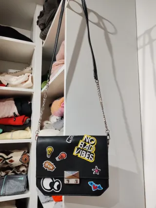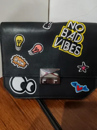 Borsa a tracolla nera con simpatici patch applicati. - Patch a forma di lampadina. - Patch con scritta BOOM. - Patch NO BAD VIBES. - Patch con occhi. - Patch con stella. - Patch con cuore alato.