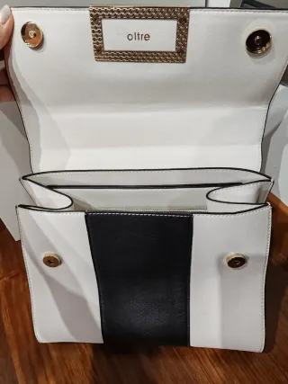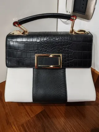 Elegante borsa a mano con un design bicolore che combina il bianco e il nero. - Dettagli in ecopelle effetto coccodrillo. - Inserti in ecopelle effetto pitone. - Chiusura con fibbia dorata. - Manico superiore.