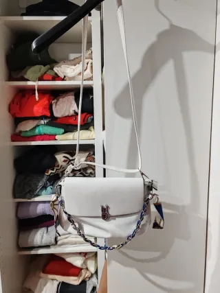 Borsa a tracolla di colore bianco, con dettagli colorati. - Tracolla regolabile. - Chiusura a girello. - Decorazione con foulard stampato.
