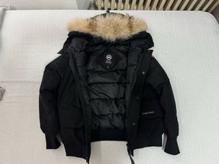 Giubbotto invernale Canada Goose di colore nero. - Cappuccio con pelliccia. - Logo Canada Goose sulla manica. - Tasche frontali. - Zip centrale.