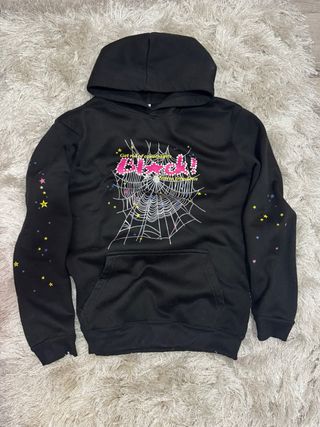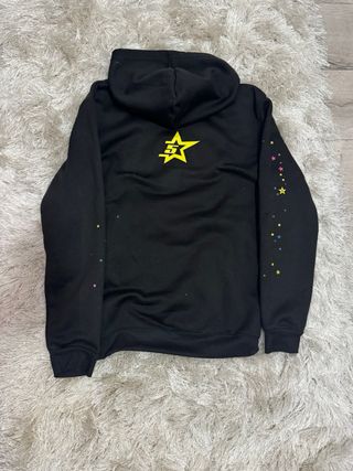 Felpa nera con un design unico sul petto e sulle maniche. Presenta una stampa di una ragnatela con scritte e stelle colorate. - Stampa centrale con ragnatela e scritte. - Dettagli a forma di stelle sulle maniche. - Cappuccio integrato.