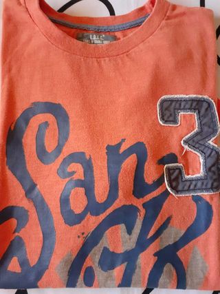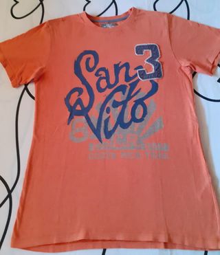 T-shirt arancione con stampa San Vito e numero 3. - Stampa San Vito blu. - Numero 3 applicato. - Dettaglio Costa Rica Trail sul fondo.