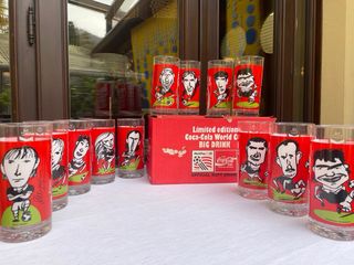 Set completo di bicchieri Coca-Cola in edizione limitata. - Serie completa di 12 bicchieri Nazionale Svizzera - Design ispirato alla FIFA World Cup USA 1994. - Illustrazioni di calciatori - Originali i tacchetti scarpini calciatori sul fondo del bicchiere 12 bicchieri in vetro da 0,5 | Collezione completa con scatola originale Bicchieri mai utilizzati, il vetro presenta qualche segno del tempo