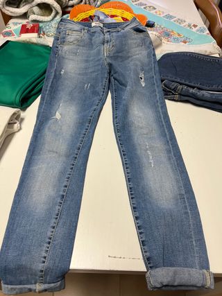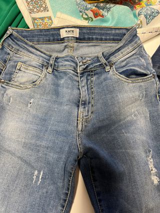 Jeans da donna KATE in denim blu con strappi. - Vestibilità slim. - Effetto used. - Vita media. - Chiusura con zip e bottone.