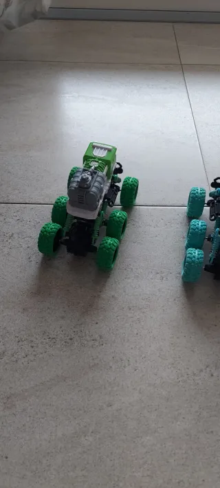 Set di due monster truck giocattolo. - Uno verde e l'altro blu. - Entrambi hanno grandi ruote. - Ideali per il gioco. Tirandoli indietro, parte la ricarica che li fa avanzare per una bella corsa. Ideale per bambini che amano I veicoli.