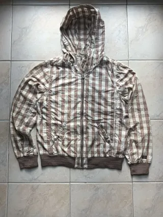 Giubbotto con cappuccio e fantasia a quadri. - Chiusura con zip. - Tasche laterali con bottoni. - Polsini e fondo elasticizzati.
